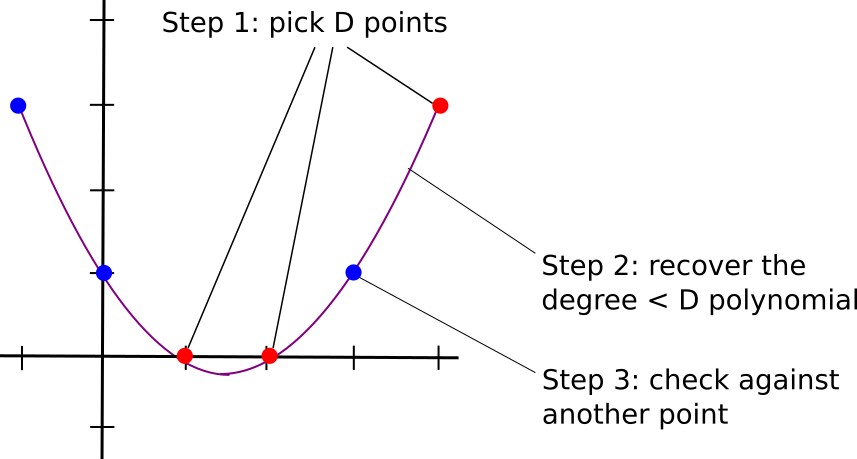 The algorithm to check if a given set of values is on the same degree \(< D\) polynomial with \(D+1\) queries is not too complex. First, select a random subset of \(D\) points, and use something like Lagrange interpolation (search for "Lagrange interpolation" here for a more detailed description) to recover the unique degree \(< D\) polynomial that passes through all of them. Then, randomly sample one more point, and check that it is on the same polynomial.