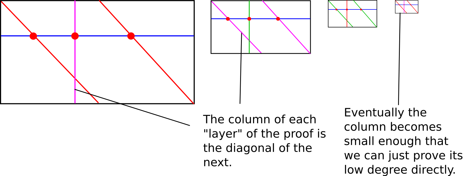 This gives the verifier a statistical proof that (i) most rows are populated mostly by points on degree \(< 1000\) polynomials, (ii) most columns are populated mostly by points on degree \(< 1000\) polynomials, and (iii) the diagonal line is mostly on these polynomials. This thus convinces the verifier that most points on the diagonal actually do correspond to a degree \(< 1,000,000\) polynomial.
