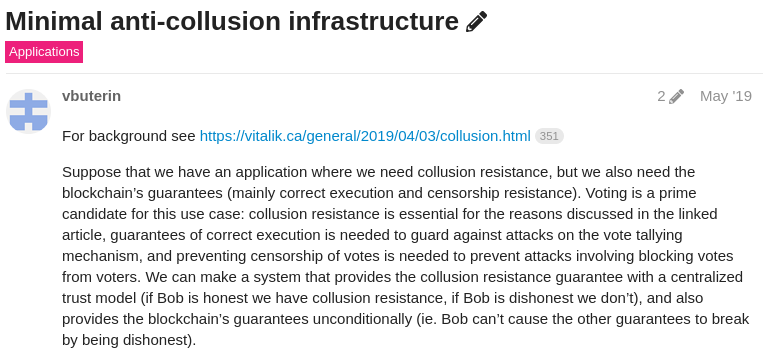 However, this is still a longer-term concern; MACI is likely not ready to be integrated for round 10. For the next few rounds, focusing on stepping up unique-human verification is still the best priority. Some ongoing reliance on centralized moderation will be required, though hopefully this can be simultaneously reduced and made more accountable to the community. The Gitcoin team has already been taking excellent steps in this direction. And if the Gitcoin team does successfully play their role as pioneers in being the first to brave and overcome these challenges, then we will end up with a secure and scalable quadratic funding system that is ready for much broader mainstream applications!