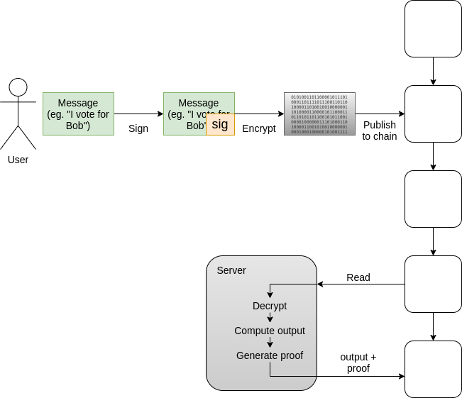 The technical description of how this works is not that difficult. Users participate by signing a message with their private key, encrypting the signed message to a public key published by a central server, and publishing the encrypted signed message to the blockchain. The server downloads the messages from the blockchain, decrypts them, processes them, and outputs the result along with a ZK-SNARK to ensure that they did the computation correctly.