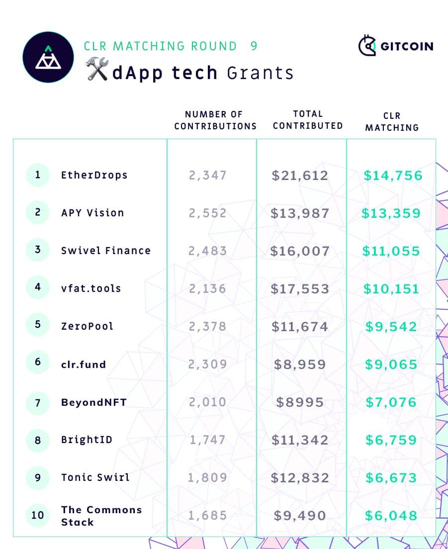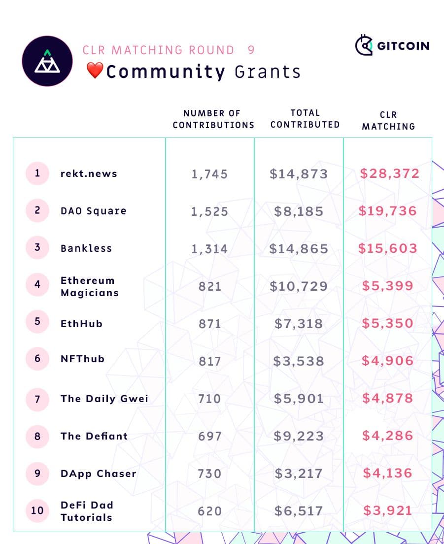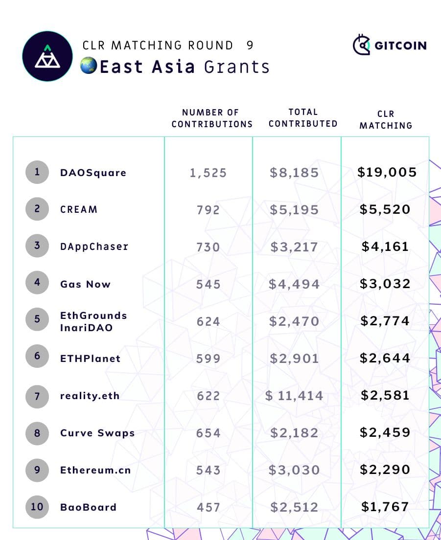 Gitcoin Grants Round 9 has just finished, and as usual the round has been a success. Along with 500,000 in matching funds, $1.38 million was donated by over 12,000 contributors to 812 different projects, making this the largest round so far. Not only old projects, but also new ones, received a large amount of funding, proving the mechanism's ability to avoid entrenchment and adapt to changing circumstances. The new East Asia-specific category in the latest two rounds has also been a success, helping to catapult multiple East Asian Ethereum projects to the forefront.
