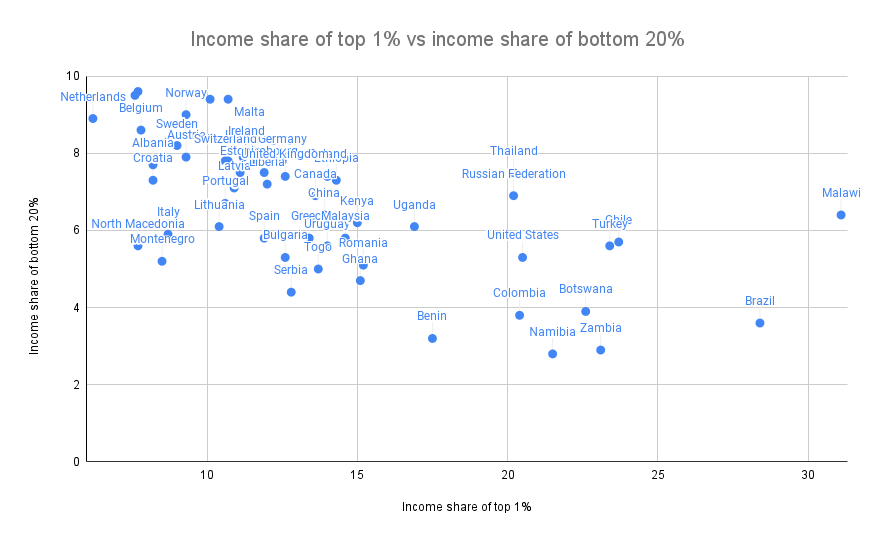 These two problems are different enough that they're worth analyzing and measuring separately. And this difference is not just theoretical. Here is a chart showing share of total income earned by the bottom 20% (a decent proxy for avoiding dystopia A) versus share of total income earned by the top 1% (a decent proxy for being near dystopia B):