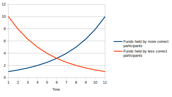 - Escalation games: see Augur and Kleros. Value-alignment on lower-level decisions is incentivized by the possibility to appeal to a higher-effort but higher-accuracy higher-level process; voters whose votes agree with the ultimate decision are rewarded.